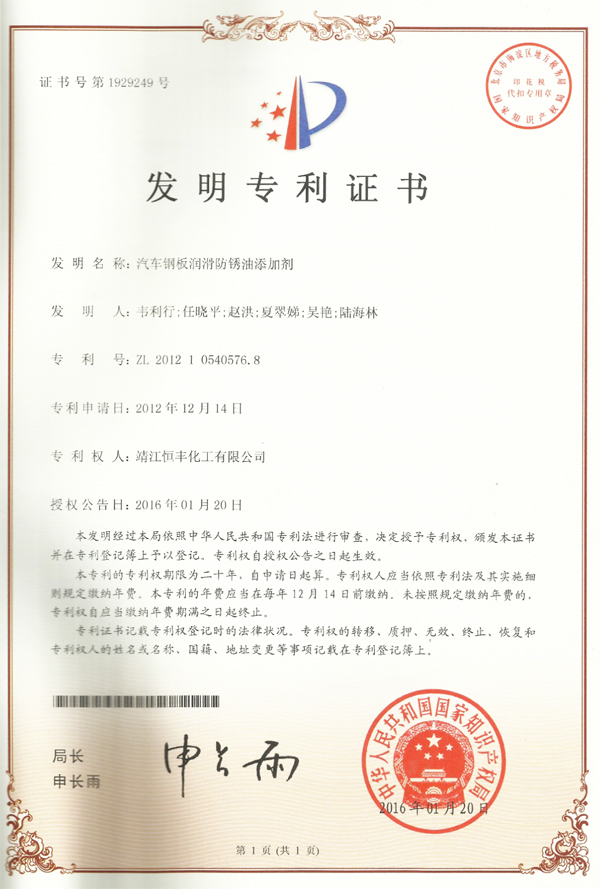 近日,我公司再傳喜訊,自主研發(fā)的“汽車鋼板潤滑防銹油添加劑”獲得國家發(fā)明專利稱號。這標志著恒豐化工一貫堅持的技術創(chuàng)新的發(fā)展路線得到了認可,公司競爭力得到進一步的彰顯。