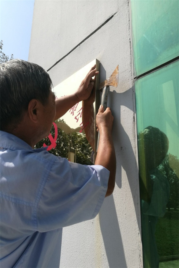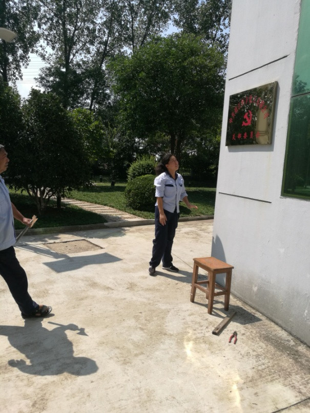 臺風過后,綜管科長心想著要將銅牌盡快重新上墻。事不宜遲!20日早上一上班,便與綜管科的魏旭霞一起來到銅牌原來懸掛的地方查看,試圖將銅牌重新掛上去,幾次嘗試均未成功。剛執(zhí)勤完準備下班的陳小衛(wèi)恰巧經(jīng)過那里,一看便發(fā)現(xiàn)了端倪,原來是用于固定該銅牌的木塊中有一根已經(jīng)腐爛,經(jīng)不起颶風和暴雨的吹打,飄搖墜落了。他二話沒說,主動找來了一根廢棄木頭,一陣“刀削斧劈”,制作出了符合尺寸要求的固定用木塊,然后將其固定在墻上;魏旭霞用抹布仔細拭去銅牌表面的水印塵土,2人攜手將銅牌上墻、扶正、固定……不一會兒,黨支部銅牌就重新懸掛好了,在烈日下放射出耀眼的光芒,而他們也早已是汗流浹背。