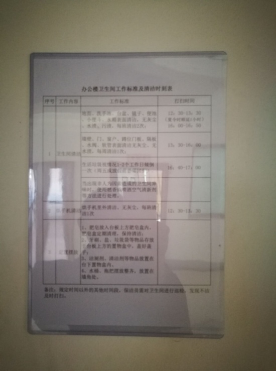 除了質(zhì)量月推進(jìn)小組發(fā)起的活動(dòng)外,各部門結(jié)合自身崗位特性,積極行動(dòng)起來(lái)。以綜管部為例,為了提高部門文明衛(wèi)生質(zhì)量,規(guī)范員工操作行為并提升工作質(zhì)量,綜管科在炊事員、清潔工等崗位原有操作規(guī)范的基礎(chǔ)上,細(xì)化、完善了《食堂清潔衛(wèi)生標(biāo)準(zhǔn)(要求)》、《辦公樓衛(wèi)生間工作標(biāo)準(zhǔn)及清潔時(shí)刻表》,并在醒目位置上墻張貼。崗位員工實(shí)現(xiàn)可視化操作,標(biāo)準(zhǔn)就在眼前,督促員工認(rèn)真按章辦事;同時(shí)讓?shí)徫粏T工逐步變被動(dòng)為主動(dòng),自覺(jué)接受其他員工的監(jiān)督,美化工作環(huán)境、提高工作質(zhì)量。