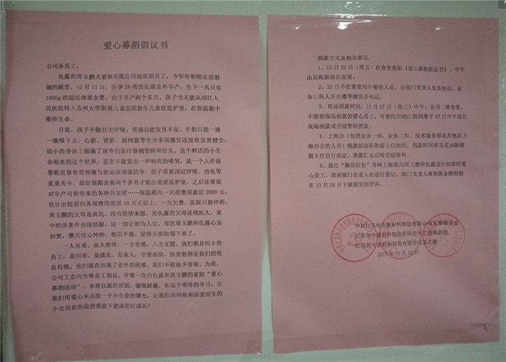 12月27日中午,公司二樓食堂,一場為技質(zhì)部周玉鵬和仇露夫婦倆剛出生不久的早產(chǎn)寶寶的愛心捐款活動正在火熱進行。